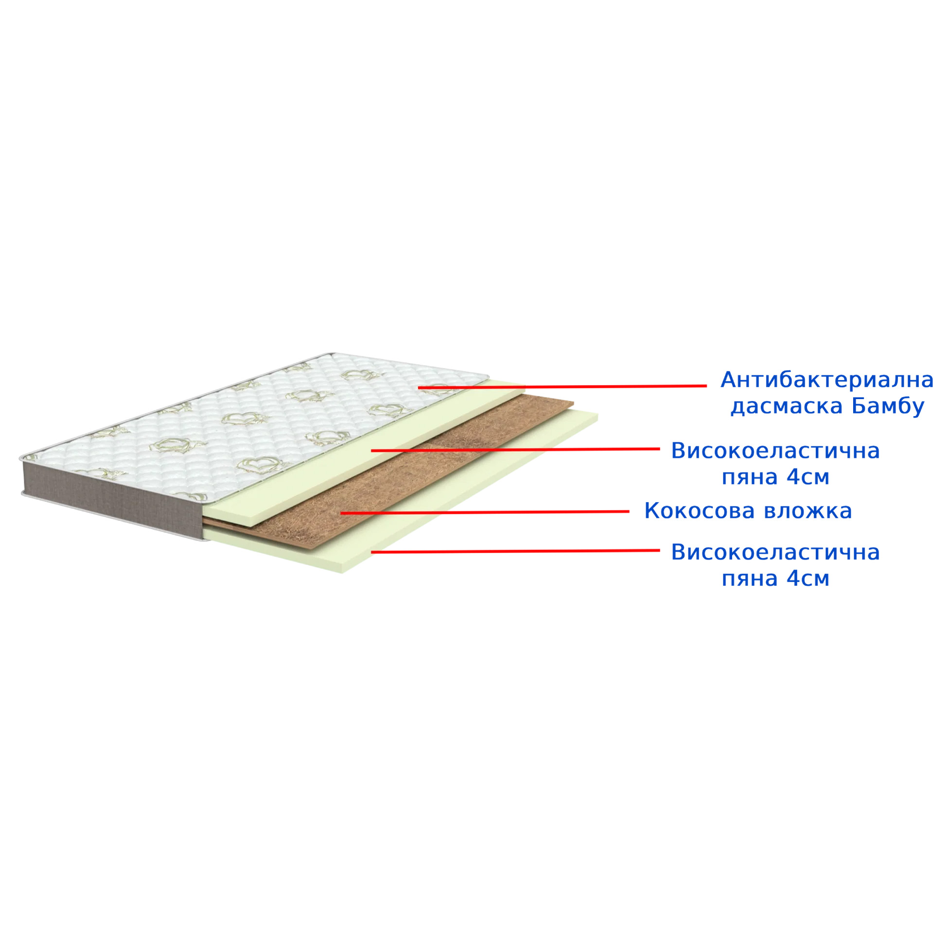 Слой кокосова вложка : Създаден за оптимална здравина и устойчивост, като осигурява здравословно позициониране на гръбначния стълб.